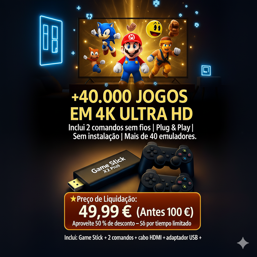 35.000 jogos é uma loucura, tenho TUDO. Reviver o GTA San Andreas com o meu filho de 12 anos é incrível. Ligar e jogar, sem complicações. Plug & play verdadeiro.